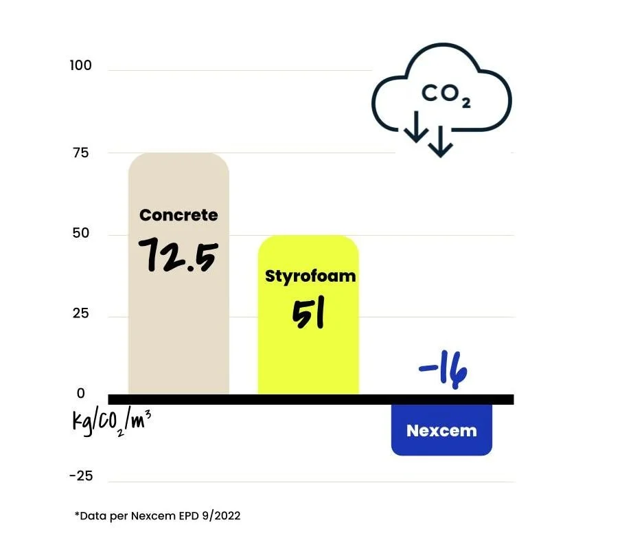 Enter Nexcem. This product utilizes wood pulp with minimal cement binding to create an insulated concrete form without foam. The blocks are lined with mineral fiber insulation on the interior of the cavity, protecting the insulation and shifting the thermal performance to the optimal location in the wall assembly. These forms are inherently structural themselves, allowing the use of less concrete in the overall project. The creation of these forms sequesters carbon through the growth of wood. Yet, this product does require some cement, which is a carbon intensive material. Overall, we see significant improvements with Nexcem over the more traditional foam ICFs.