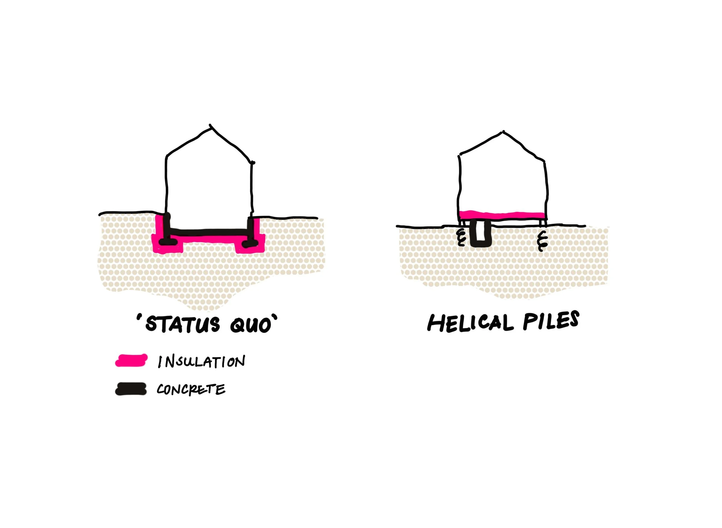 Helical piles are as they sound, a spiral shaped pile that is drilled into the earth to a specified depth. The installation is done by a machine that locates the geometry with accuracy, drives up, screws down the pile and leaves the site. There is no downtime for liquid concrete delivery, curing, or disassembly of formwork. It eliminates the need for the highest embodied carbon material on a project, and is every bit as structurally functional as a default concrete foundation.